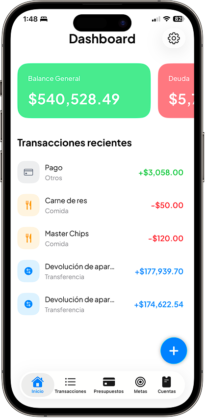 Echa un vistazo a algunas de las pantallas clave que hacen que gestionar tus finanzas sea simple y visual.